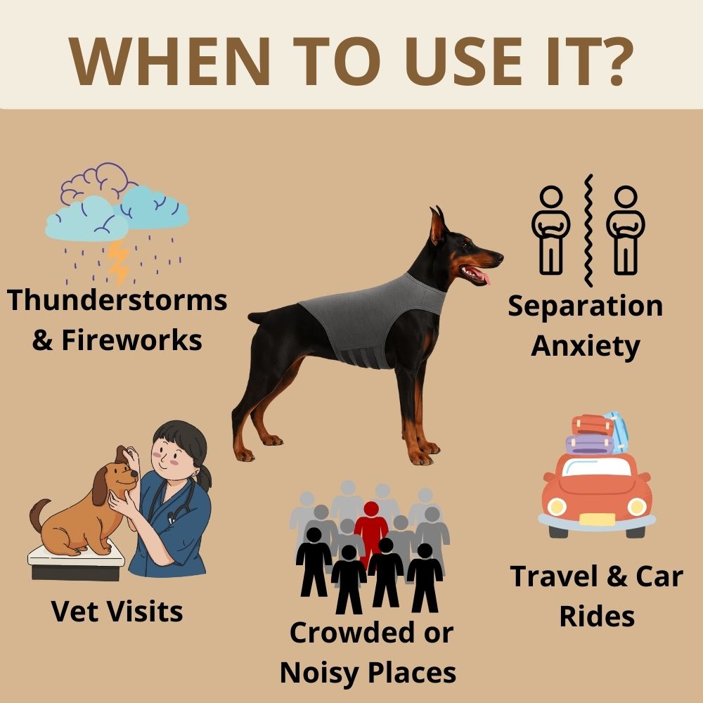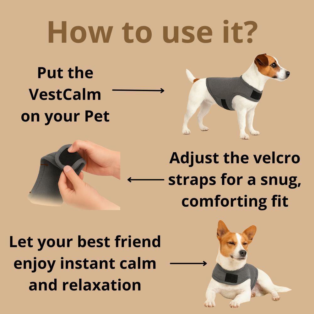 You can use VestCalm™ during stressful events such as storms, fireworks, vet visits, car rides, or when your pet shows signs of anxiety. It’s also great for helping pets feel more secure in new environments.